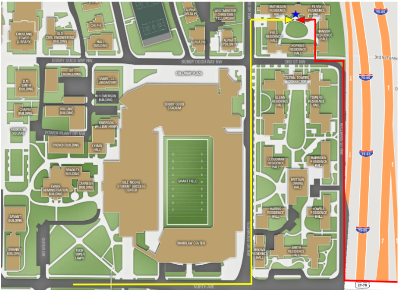 3. Walk east on North Avenue, turning left at Techwood Drive (just passed the stadium). Head north on Techwood until you see Field Residence Hall and Hopkins Residence Hall on your right. Walk between those two Halls and Perry Residence Hall will be across the quad